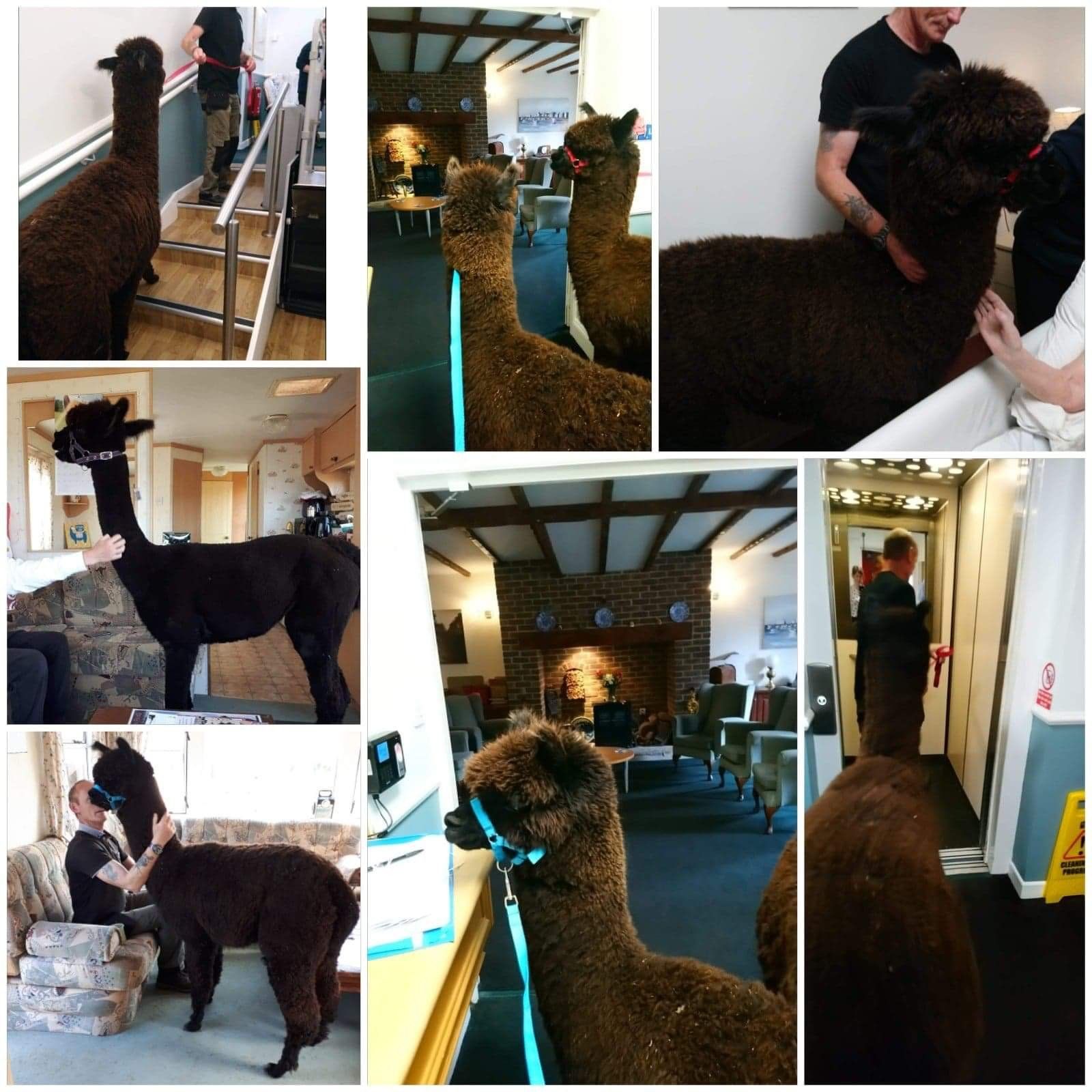 ButtonAlpacas are renowned for their therapeutic properties our Alpacas are very friendly quiet and well behaved. Residents can stroke the Alpacas and feel their magnificent soft fleece, or just sit with them and listen to their humming. We will take pictures if you would like. If the weather is good we can take the Alpacas outside to be with the residents.